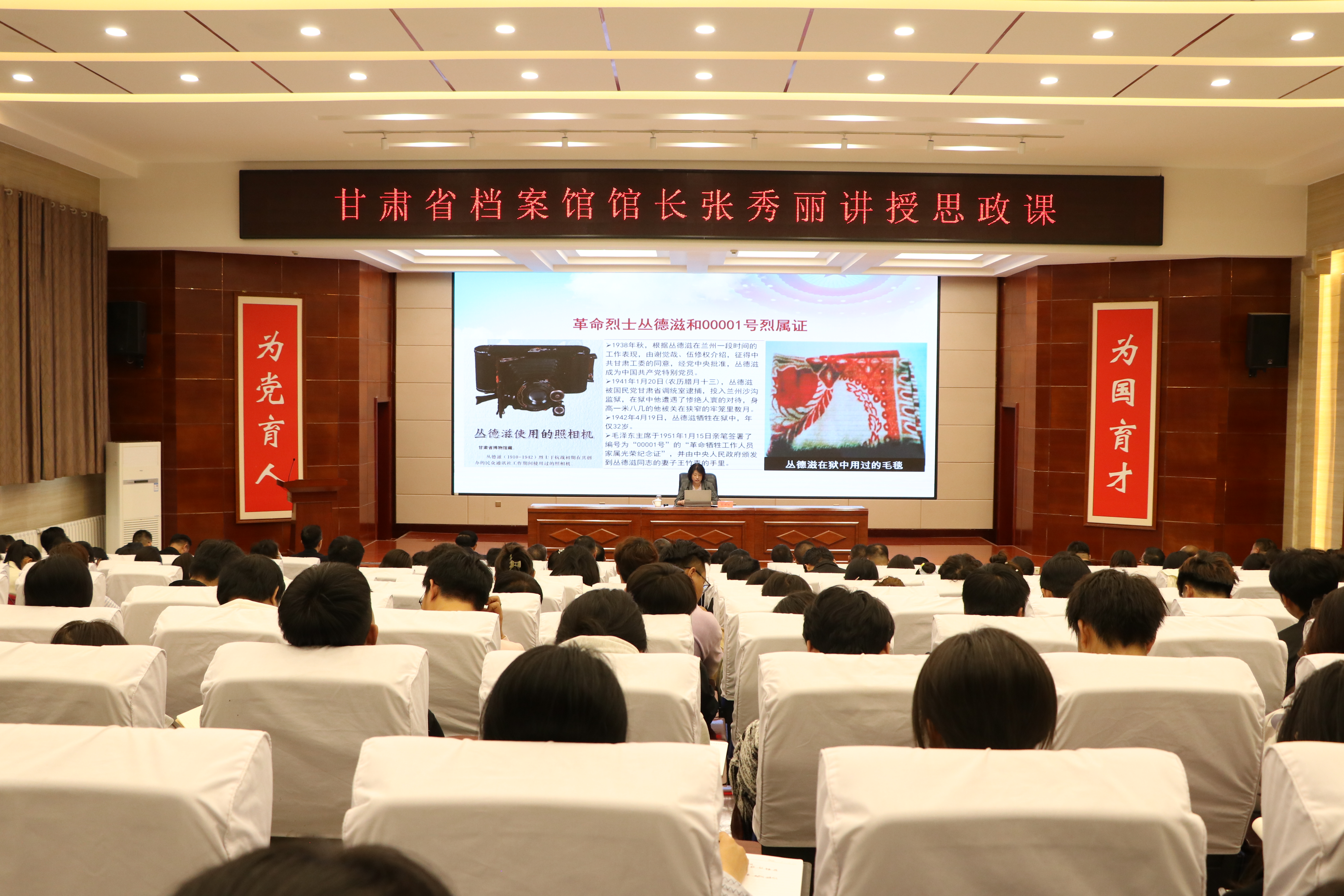 張秀麗結(jié)合自身從事檔案管理和文化研究的豐富經(jīng)驗,從檔案“存史、資政、育人”根本任務(wù)出發(fā),通過大量珍貴檔案文獻和歷史案例,系統(tǒng)闡述了檔案在記錄民族苦難輝煌、服務(wù)當(dāng)代治國理政、培育時代新人中的重要作用。報告中,她以館藏漢代簡牘、革命烈士叢德滋00001號烈屬證、民勤治沙檔案、甘肅地震檔案等一批具有歷史代表性和地域特色的檔案為載體,帶領(lǐng)師生穿越時空,感受中華民族生生不息的精神力量,深刻解讀“勿忘昨天的苦難輝煌,無愧今天的使命擔(dān)當(dāng),不負明天的偉大夢想”的時代內(nèi)涵。
