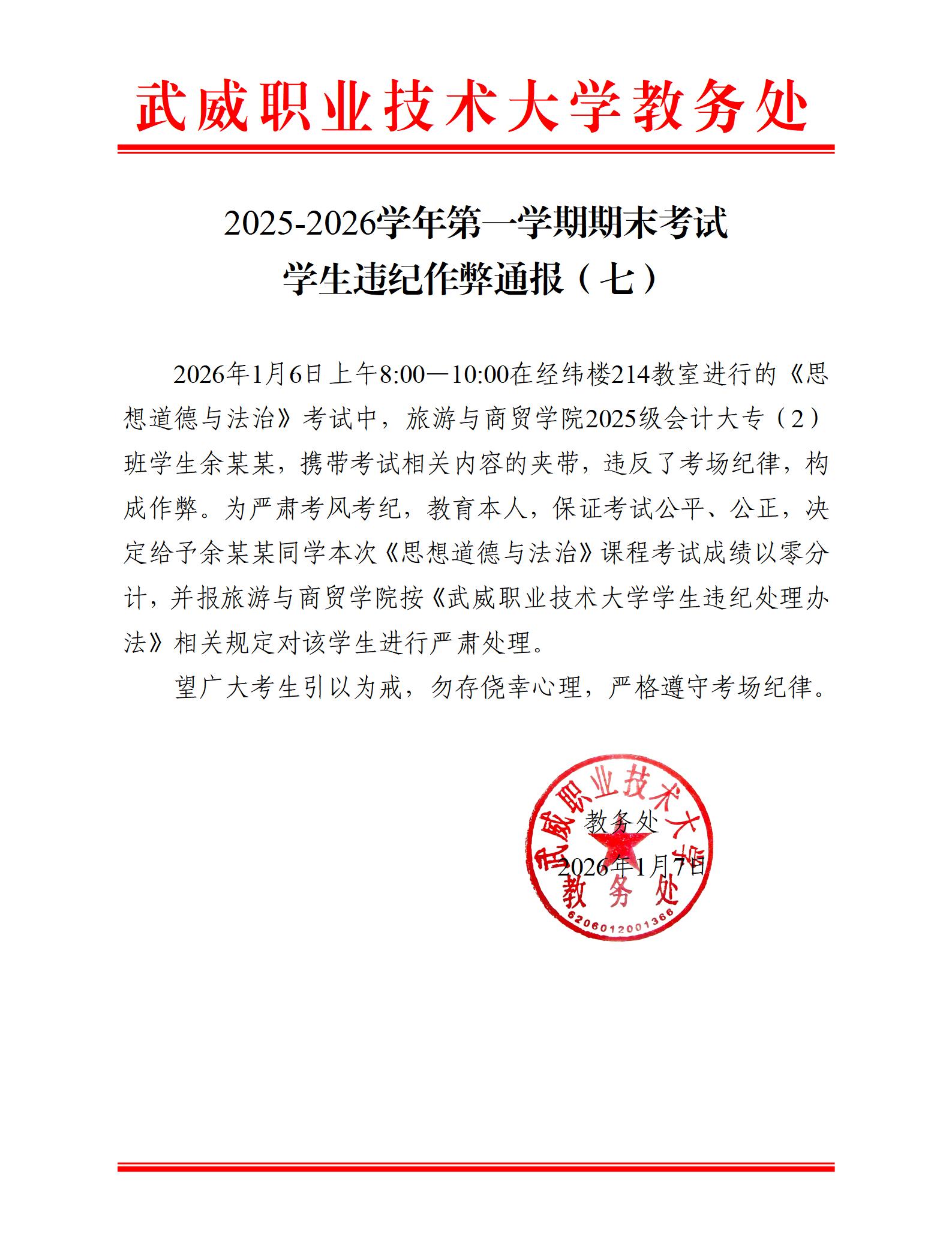 2025-2026學年第一學期期末考試學生違紀作弊通報(七)